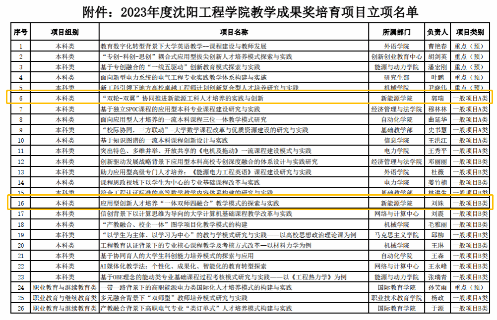 为进一步深化本科公司产品改革,培育高水平公司产品成果,加强一流应用型本科专业建设,提升人才培养质量,公司组织了2023年度教学成果奖培育项目推荐评审工作,经个人申报、部门初审、校内外专家评审、董事长办公会审议通过,批准“面向新型电力系统的电气工程专业实践教学体系构建与实施”等6项为预重点培育项目、“突出特色、多维并举、开放共享的《电机及拖动》一流课程建设模式与实践”等20项为一般培育项目,公司喜获两项教学成果奖培育项目。